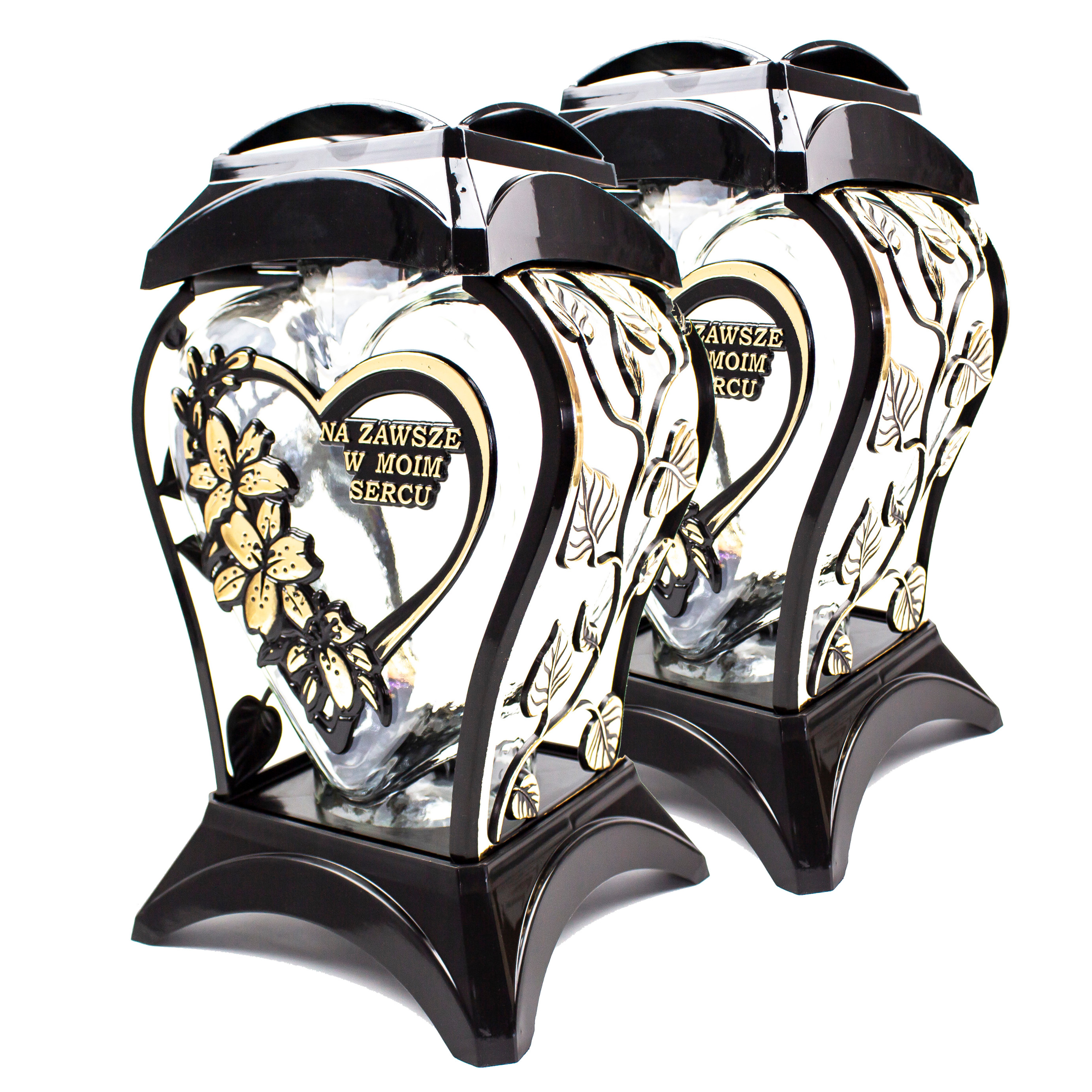 Elegancki znicz nagrobny w kształcie serca, wykonany ze szkła i tworzywa w czarno-złotej kolorystyce. Zdobiony motywem kwiatów i napisem „Na zawsze w moim sercu”. Trwały i odporny na warunki atmosferyczne, idealny do upamiętnienia bliskich.