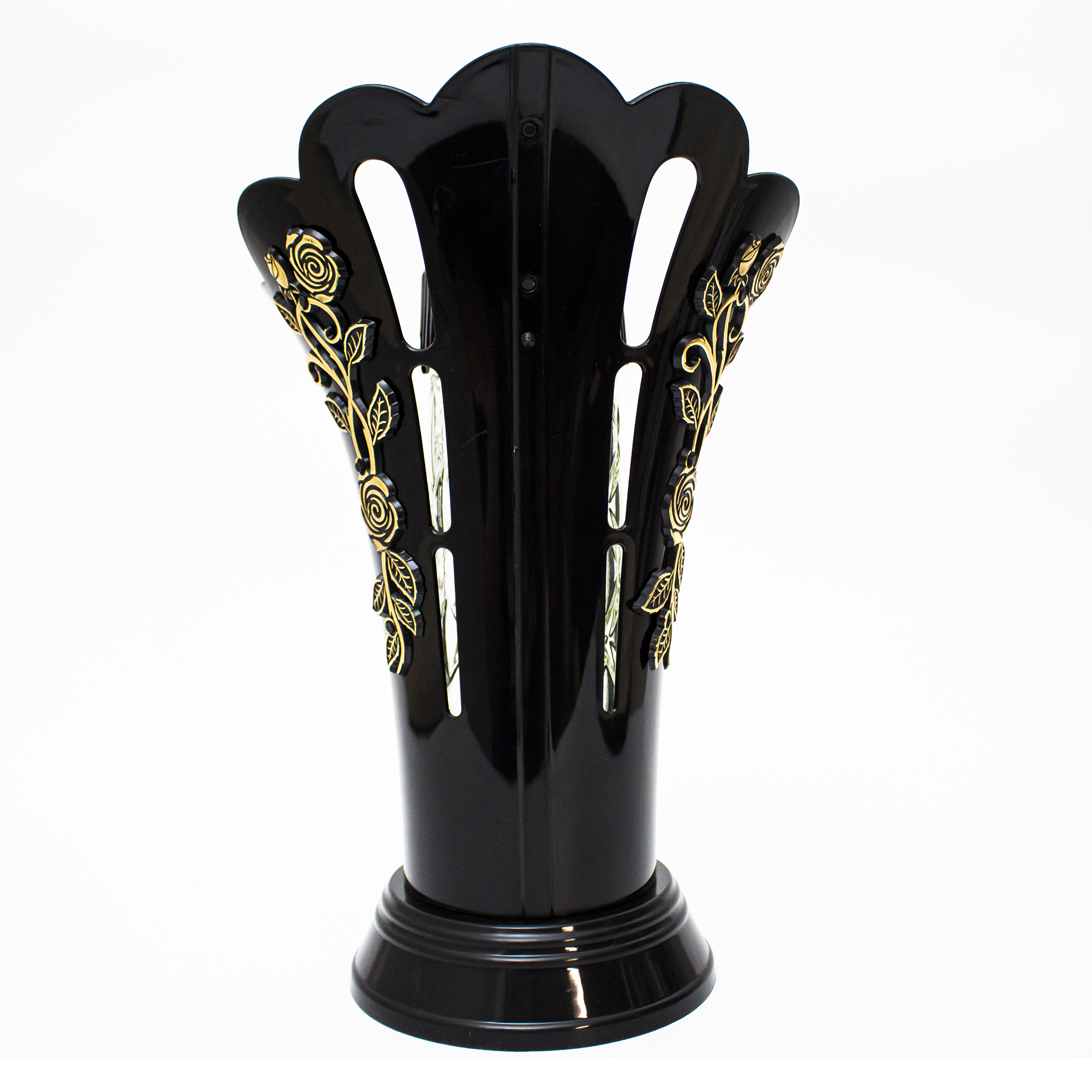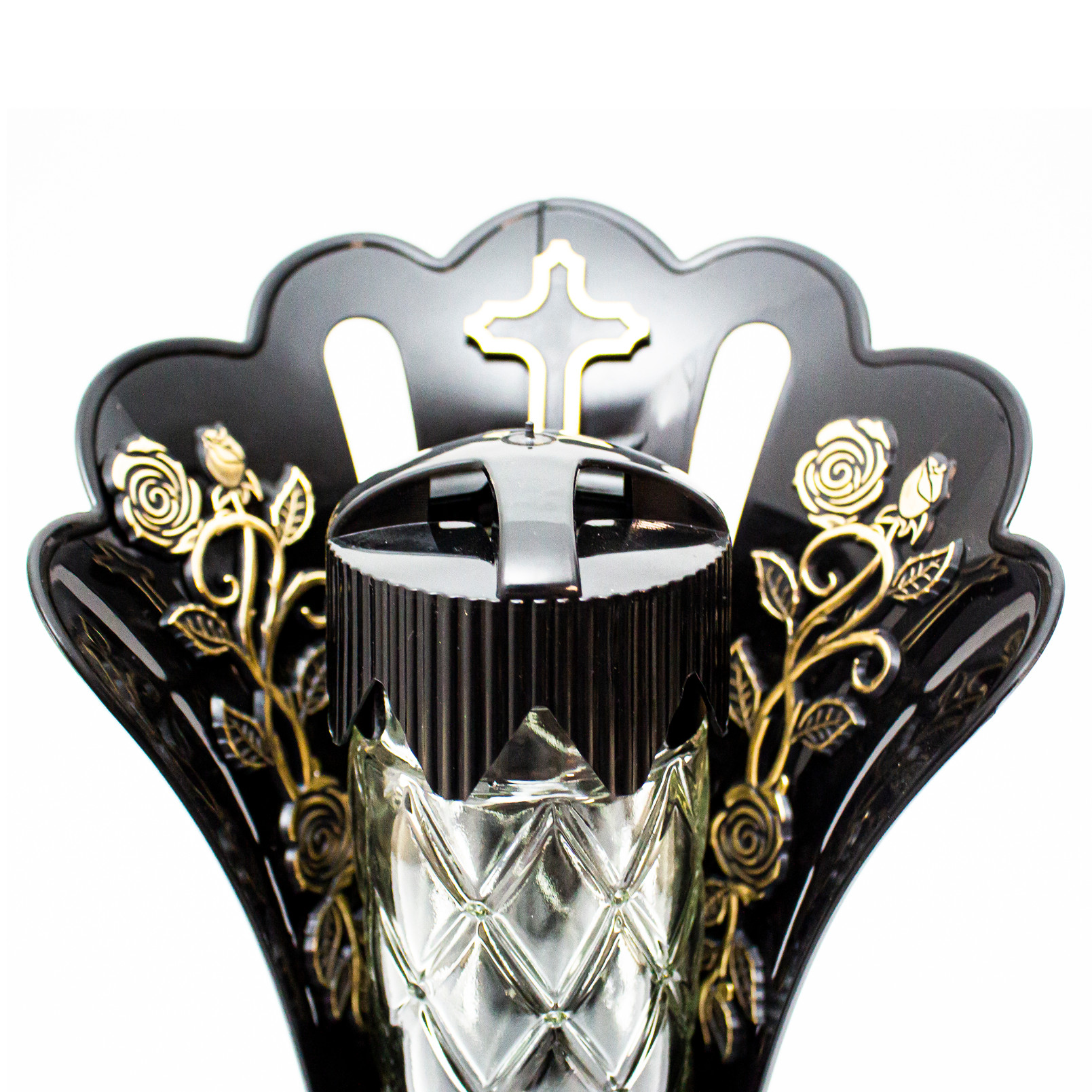 Dekoracyjny znicz nagrobny o subtelnej, delikatnej formie, wyposażony w podstawkę i złoty kapturek. Jego elegancki design oraz precyzyjne wykonanie sprawiają, że stanowi wyjątkowy symbol pamięci.